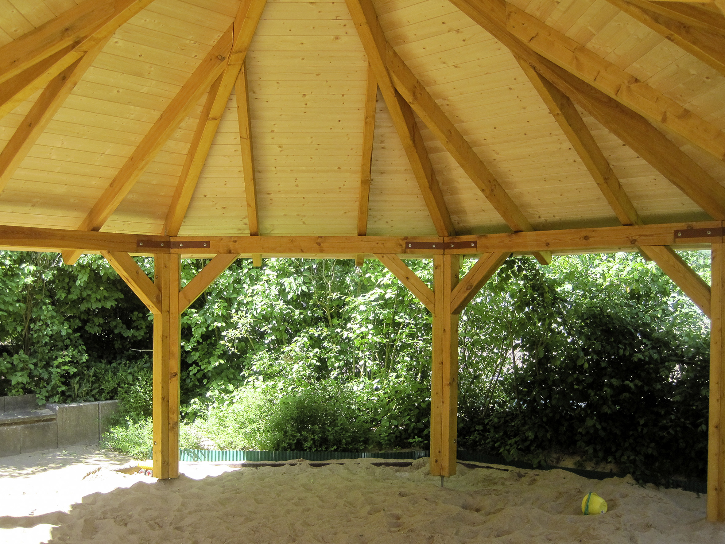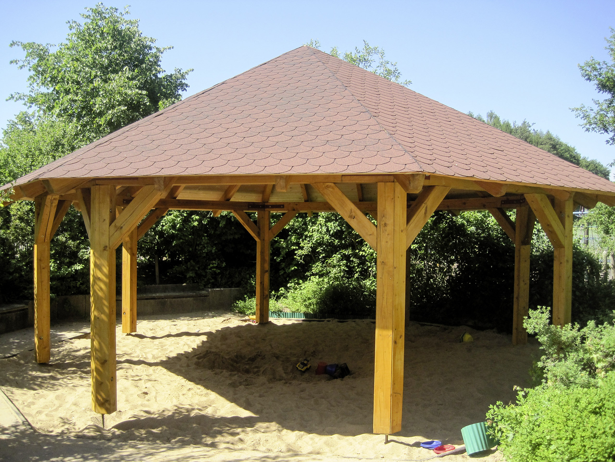Pavillons sind in verschiedenen Formen als 6-eck, 5-eck oder 4-eck und unterschiedlichen Größen und Ausführungen, mit Holzdach oder Schindeln, verkleidet oder offen, möglich. Zusätzlich kann ihr individuell geplanter Pavillon mit Bänken und Tischen oder Sitzbalken ausgestattet werden.