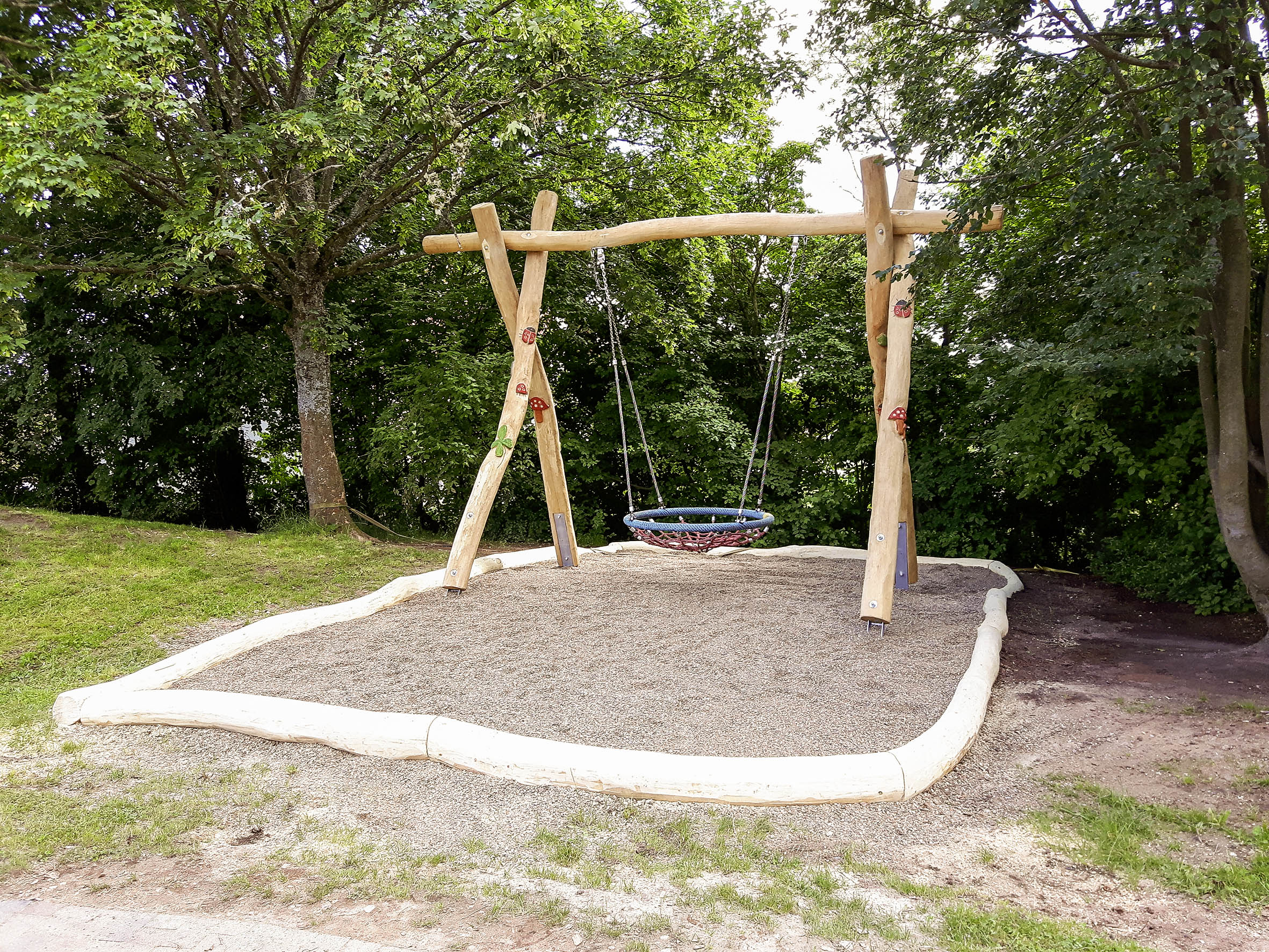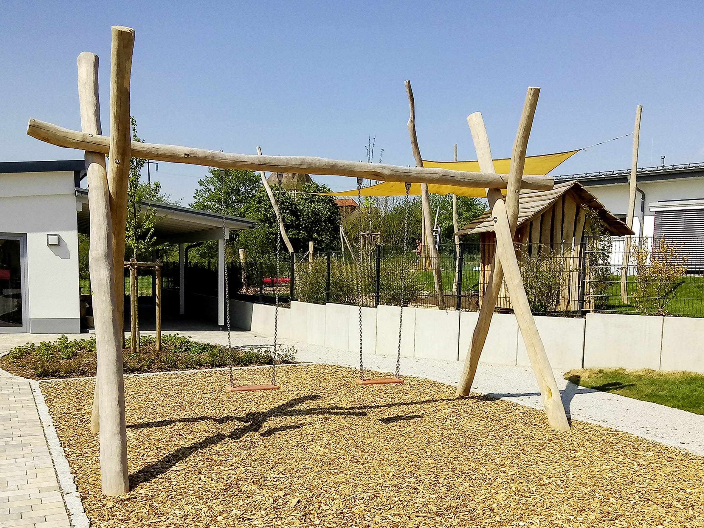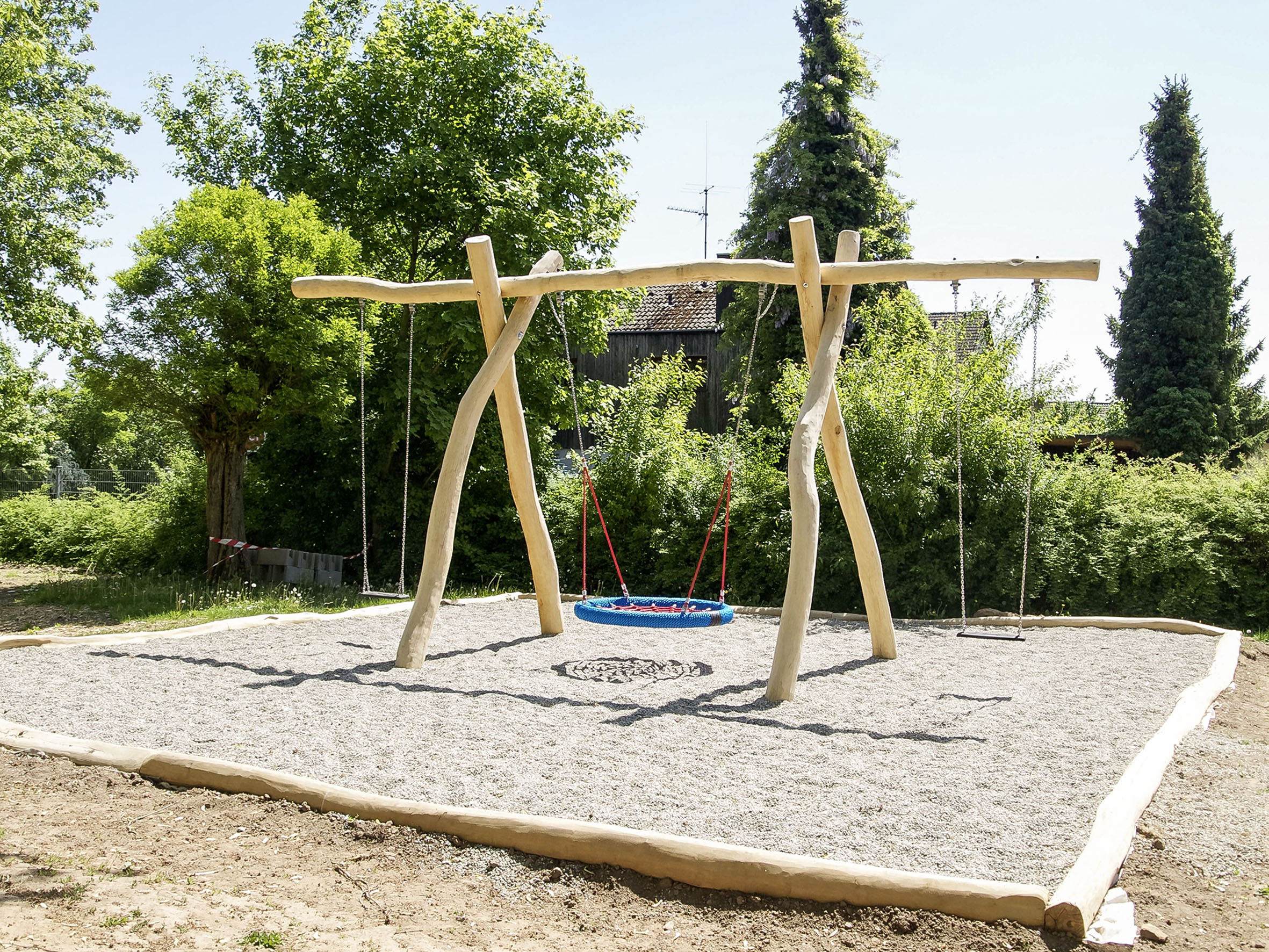 Größe des Schaukelgerüsts und Ausstattung wahlweise mit Brettschaukeln, Vogelnestschaukeln, Kleinkindschaukelsitzen oder Tellerschaukeln, sind möglich. Ihre Schaukel kann zusätzlich mit dekorativen, handgeschnitzten Stelen Teil eines Themenspielplatzes sein.